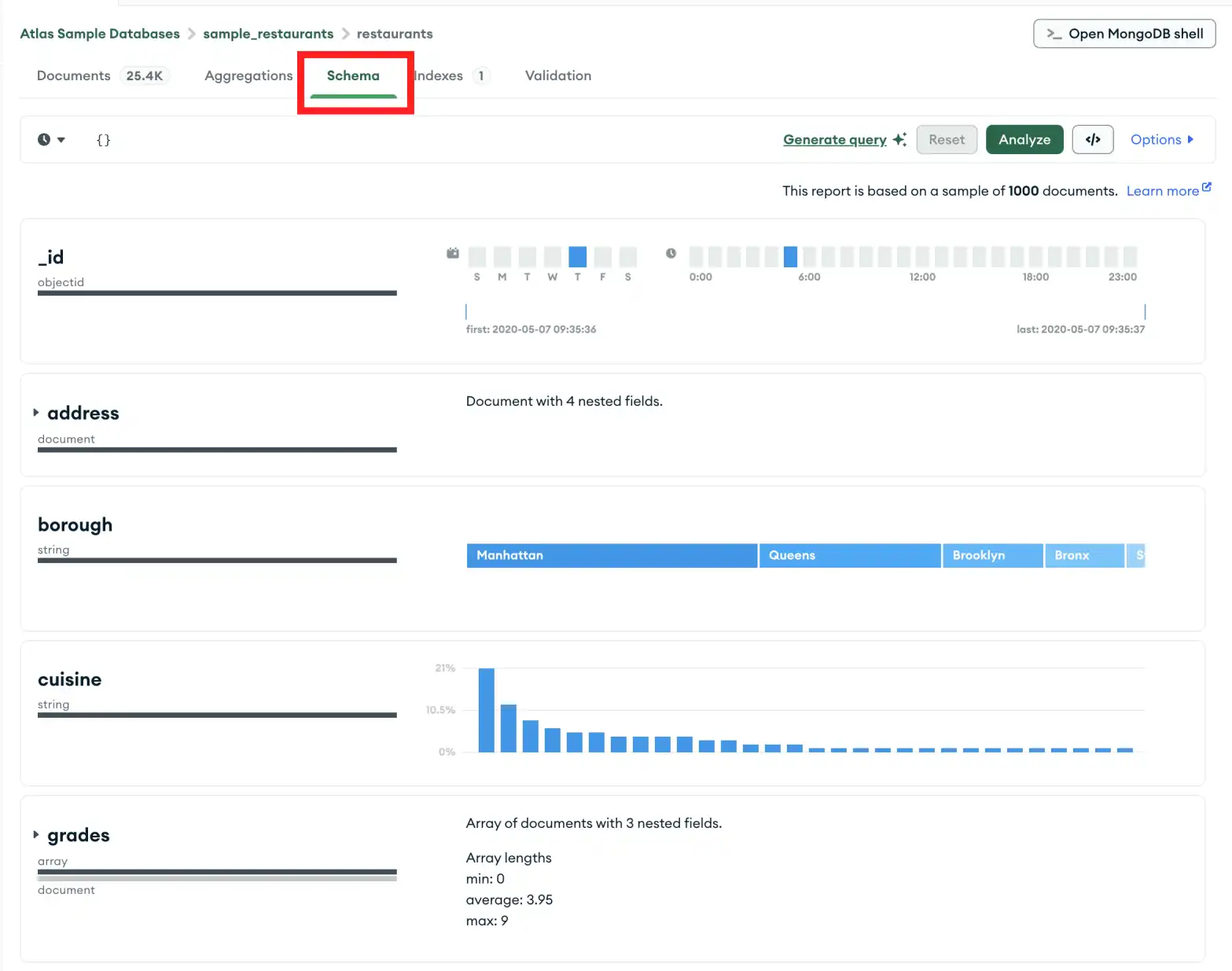 The Schema tab provides an overview of the data type and shape of the fields in a particular collection. Databases and collections are visible in the left-side navigation.