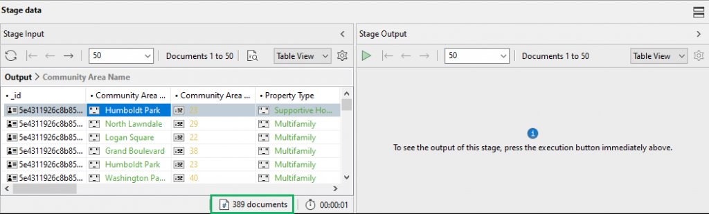 By clicking on Count Documents, we can see that there were 389 input documents, which is exactly how many documents there are in the 通过点击“计数文档”,我们可以看到有389个输入文档,这正是housing collection.housing集合中有多少文档。