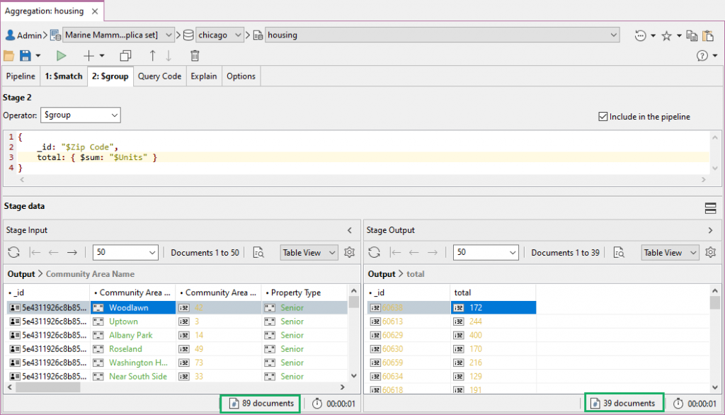 We now need a way to group the senior housing units from Stage 1 by zip code, and then calculate the sum of housing units for each zip code. 我们现在需要一种方法,将第一阶段的老年住房单元按邮政编码分组,然后计算每个邮政编码的住房单元总数。The $group operator is exactly what we need for this.$group运算符正是我们所需要的。